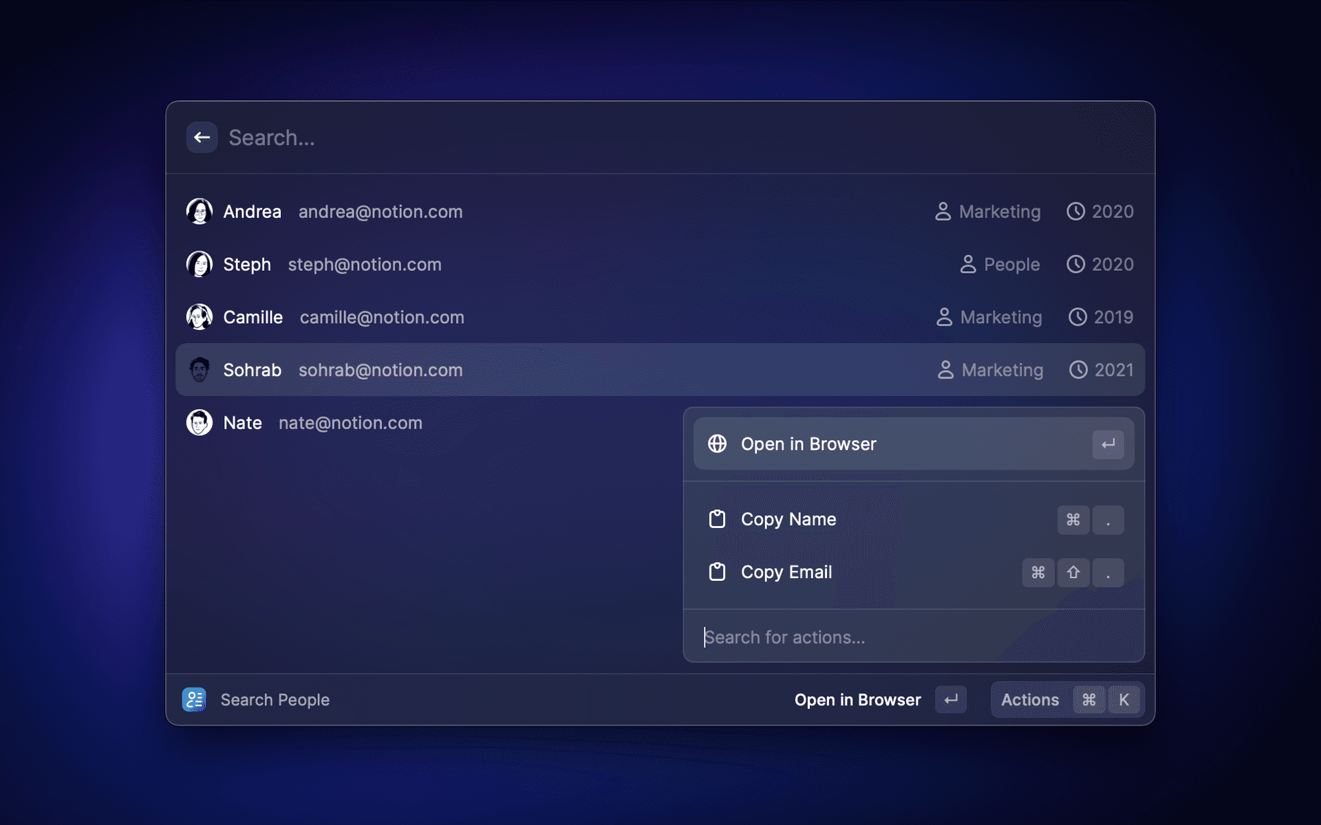 npx create-raycast-extension -t people-directoryWithin a startup, it can be hard to stay on top of your growing employee base. This extension makes it easy to discover your colleagues.
