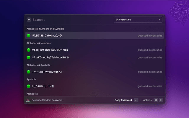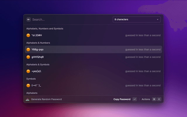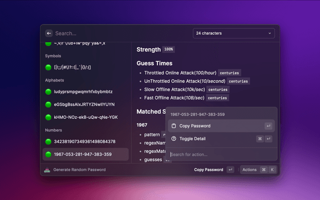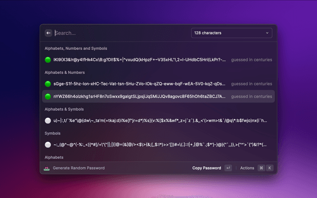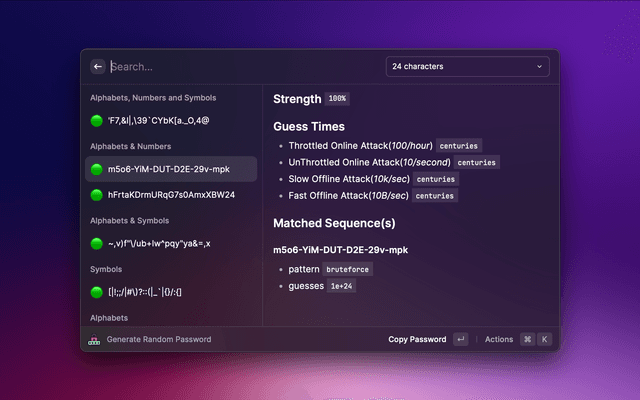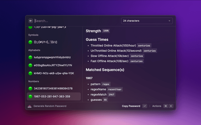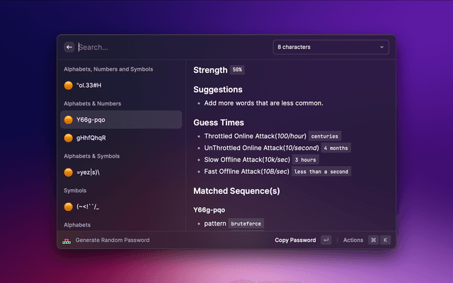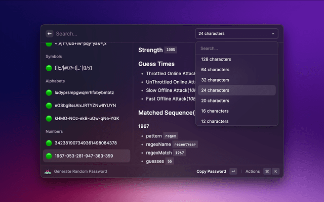 Generates a password from 5–64 characters with options for case, special characters, and more