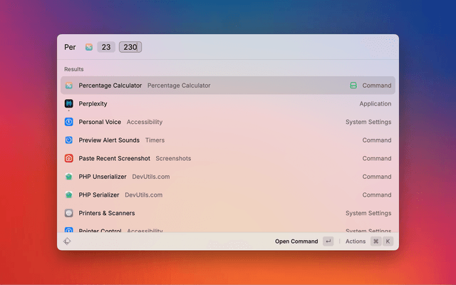 - Type "Percentage Calculator" or "perc" in Raycast