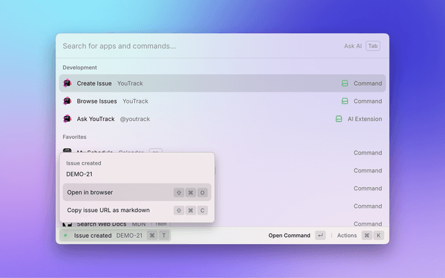 After setting up your token you should be able to browse and create YouTrack issues with Raycast 🚀.