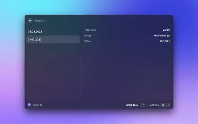 🔎 Search your time records 📋 Copy and paste fields 🆕 Create new tasks ⏯︎ Start/Stop tasks