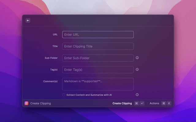 Obsidian Clippings is an opionated extension for Raycast that allows users to save things from the web directly to their Obsidian Vault. The extension will save and format the page metadata supplied, including title, sub-folder, tag(s), and comments, with the option to extract and summarize the contents of the page using Raycast AI. If the sub-folder does not yet exist, it will create it.