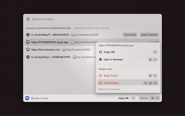 ngrok is a simplified, API-first ingress-as-a-service that adds connectivity, security, and observability to your apps with just one command. Be sure to explore the available actions in the action panel (⌘ + K).