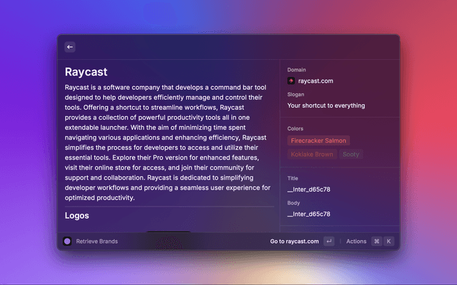 This is a Raycast extension to get a company's brand logos, colors, slogan, socials, and more via the Brand.dev API.