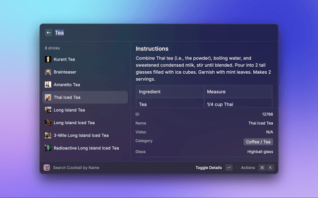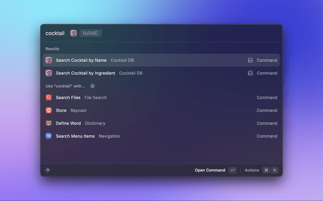 This is a Raycast extension to get a Cocktail by its Name or Ingredient using https://www.thecocktaildb.com/api.php. An API Key is not required but the Free version is limited to 25 items at a time. If you need more features, you can subscribe to their Patreon to get a paid API Key. You can then enter this API Key in Preferences.