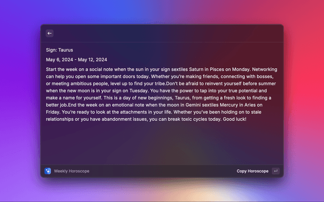 Get Daily, Weekly or Monthly Horoscope by Sign via https://horoscope-app-api.vercel.app/.