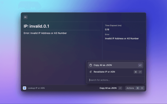 This is a Raycast extension for ipapi.is. With this extension you can Lookup IP or ASN via the ipapi.is API.