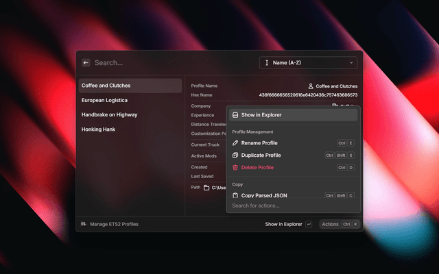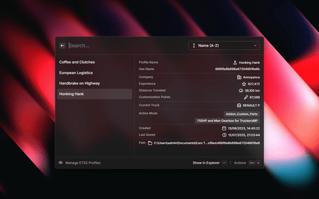 Manage your Euro Truck Simulator 2 and American Truck Simulator profiles directly from Raycast. View and rename your game profiles with ease.